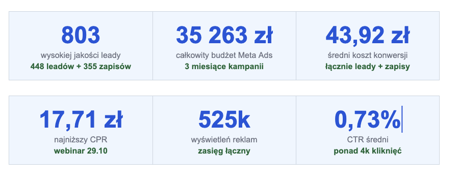 Dwa główne formaty kampanii uzupełniały się wzajemnie – instant formy generowały kontakt bezpośrednio w interfejsie Facebooka/Instagrama, natomiast kampanie ruchu na webinary przyciągały użytkowników na zewnętrzne landing page z formularzem rejestracyjnym.