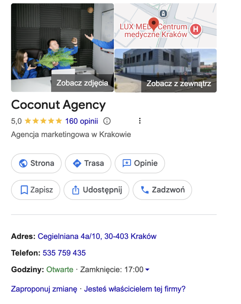 W Coconut Agency widzimy to w danych: dla firm lokalnych (HoReCa, Beauty, Medycyna, Usługi), Mapy Google generują nawet 60% przychodu. To stąd pochodzą telefony i nawigacja do lokalu.